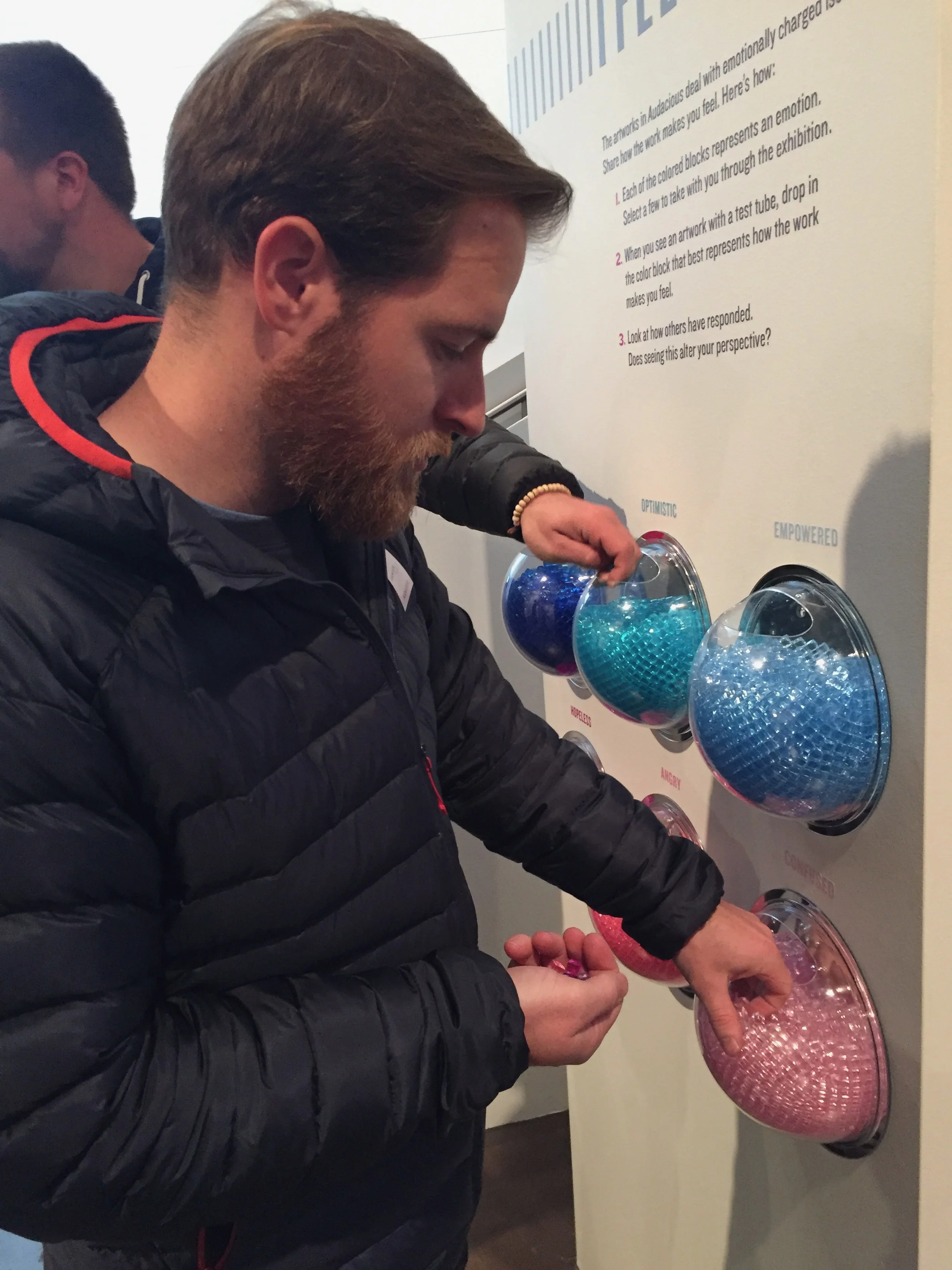 This activity was developed as a way for visitors to respond to emotionally charged issues presented by the artists in this exhibition. Visitors were invited to share how the work made them feel by leaving behind a colored bead that represented an emotion in a test tube at selected works of art. They were also able to see the reactions of others and view the work with a new perspective.